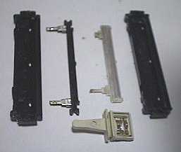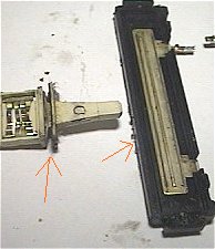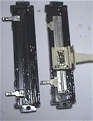 まずは分解します。両脇の金具をはずしますが、非常にもろいので折れないように注意してください。(注意しても折れますが・・・)折らないように外すには、数多くこなしコツをつかむしかありません。自信の無い人は危険なので絶対分解しないで下さい! 右図が構成パーツです。このカーボン部を外せば多少手荒に扱っても大丈夫なので、このとき、ボディとツマミを無水アルコールなどで洗浄しておきましょう。 ![]() 右図の矢印のような汚れは綺麗に取っておくとスライダーの動きが良くなります。 また、金属の板が黄色く変色していたり、最悪の場合緑錆を噴いてる場合もあるのでよく掃除します。洗浄剤で拭いても落ちないときは(目の細かい)紙やすりやスチールウールなどで軽く擦っても良いです。大きな傷をつけないように気を付けてください。表面のメッキもなるべく剥がさないようにしてください。また、スチールウールを使う場合、細かい粉がシンセ内部に入ると最悪なので細心の注意を払ってください。カーボン部は非常にデリケートなのでとにかく注意して扱ってください。 ここには洗浄剤はかけない方が無難です。保護剤を少量かけて綿棒などで軽く拭いてください。端のほうには古くなったグリスが溜まっている場合は少しずつ綺麗に落とします。 綺麗になったら表面をよく観察してください。カーボンが剥がれている部分がありませんか?あまりにひどい場合はしょうがないですが。ブラシの後が多少削れている程度であれば、ブラシを少し曲げてカーボンの削れた部分を避ける様にすればごまかせます。 最後に保護剤をもう一度かけます(数滴程度で良い)。スクアラン系のものは浸透性が高いので時間を置いてもう一度かけてもいいと思います。 ![]() 最後にグリスアップをします。レールの部分にグリスを入れてください。グリスを入れたら仮組みしてスムーズに動くか試してみます。粘性の低いグリスではスライダーが軽くなってしまいますが、それはしょうがないので目を瞑りましょう。気に入らない場合は粘度の高いグリス(粒子は細かいもの)をなんとか手に入れてください。 あとは、組みたてるだけですが、オシレータなどを持っている場合は、ためしに音を入れてガリが無いかチェックしてから組みたてたほうが良いと思います。固定金具は非常にもろいので折れないように注意してはめてください。もし折れてしまった場合は、エポキシでくっつけるなり、インシュロックで縛るなり、適当に修復してください。 以上で終了です。これで直らない場合は交換するしかありません。しかし、交換用スライダーの入手は非常に困難です。最悪の場合、アルプスなどのスライダーで長さが同じ位のものがありますので、それの土台にプラ棒などで下駄をはかせて基盤に接着してしまうという方法もあります。タッチや感覚が変わってしまいますが、ガリとは無縁の滑らかなスライダーを手に入れることができます。 2004/6 補足
